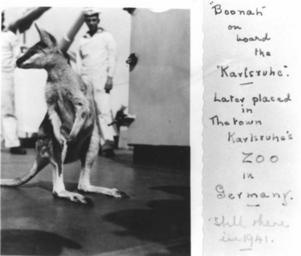 Keywords: StateLibQld 1 270305 Kangaroo on board the German warship 'Karlsruhe', 1934.jpg en Kangaroo on board the German warship 'Karlsruhe' 1934 The kangaroo 'Boonah' on board the 'Karlsruhe' The kangaroo was later placed in the town Karlsruhe's zoo in Germany It was still there in 1941 1934 handle 10462/deriv/685 Item is held by John Oxley Library State Library of Queensland PD-Australia StateLibQld-License Unidentified Macropus Sailors from Germany Karlsruhe ship 1927 Känguruh Ships in Queensland Karlsruhe 1934 in Queensland Black and white photographs |