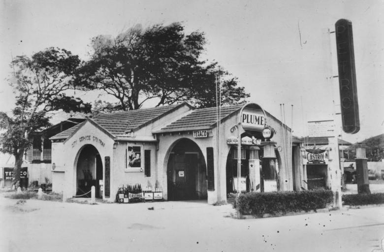Keywords: StateLibQld 1 290915 City Service Station, Mackay, 1939.jpg en City Service Station Mackay 1939 Spanish style building with feature arches and tiled roof Several petrol pumps are lined up outside the building Various advertising signs for branded petrol including Plume Castol and Texaco are placed on the building City Service Sation is written above one of the arches A collection of oil bottles have been placed under a poster between two of the arches A very large neon petrol sign is at the front of the building facing the road 1939 handle 10462/deriv/149646 Item is held by John Oxley Library State Library of Queensland PD-Australia StateLibQld-License Advertising signs in Queensland Buildings in Mackay 1939 in Australia Black and white photographs Petrol stations in Queensland |