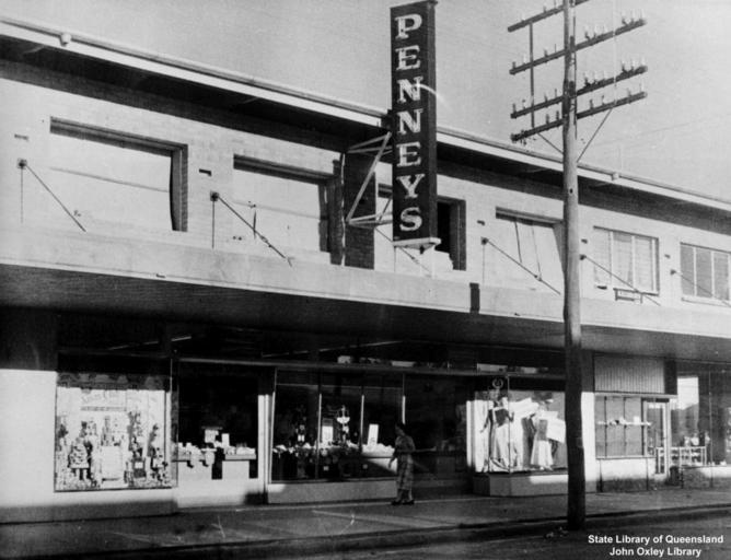 | Keywords: StateLibQld 1 46896 Penneys store in Wills Street, Charleville, ca. 1955.jpg en Penneys store in Wills Street Charleville ca 1955 A woman strolls along the footpath in front of Penneys variety store Three shop windows can be seen each with a different display A counter can be seen through a glass door Above the awning is a second storey which has several large windows facing the street and the Penneys' sign attached to the wall and roof of the awning This store was purchased by G J Coles and converted to a Coles store in 1960 circa 1955 handle 10462/deriv/55355 Item is held by John Oxley Library State Library of Queensland PD-Australia StateLibQld-License Shops in Queensland Shopfronts Verandas in Australia Walking paths in Australia Utility poles in Australia Buildings in Charleville Queensland Black and white photographs |