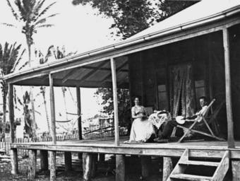 Keywords: StateLibQld 1 66031 Man and woman relaxing on the verandah of their farmhouse, 1911.jpg en Man and woman relaxing on the verandah of their farmhouse 1911 A man and woman relax on deck chairs on the verandah of their home in 1911 A hammock hangs in the corner of the verandah and palm trees blow in the breeze in the background The man holds a small hand fan and tea is being served on an elaborate lace tablecloth 1911-06-01 handle 10462/deriv/77150 Item is held by John Oxley Library State Library of Queensland PD-Australia StateLibQld-License Verandas on single story Queensland houses Deckchairs in Australia Arecaceae in Australia Hammocks Sheep and cattle stations in Queensland 1911 in Australia Black and white photographs Tea on the veranda Queensland |
