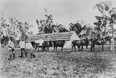 Keywords: StateLibQld 1 71371 Stable at Condamine Plains Station, ca. 1875.jpg en Stable at Condamine Plains Station ca 1875 A horse team is tethered outside the stable building Three gentlemen and a dog can be seen in the vicinity of the horses circa 1875 handle 10462/deriv/86699 Item is held by John Oxley Library State Library of Queensland PD-Australia StateLibQld-License Horses of Queensland Farm buildings in Australia Bark roofs Farmers from Australia Manual workers of Australia Sheep and cattle stations in Queensland Black and white photographs Stables in Queensland |