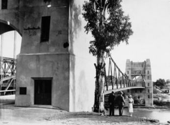 | Keywords: StateLibQld 1 74674 Indooroopilly Toll Bridge, Brisbane, 1936.jpg en Indooroopilly Toll Bridge Brisbane 1936 This suspension bridge spans the Brisbane River connecting Indooroopilly to Chelmer Walter Taylor was the driving force behind the contruction of the bridge being promotor constructor and engineer of the company which was formed Construction began early in 1932 and the bridge was officially opened on February 14 1936 Information taken from The Indooroopilly toll bridge a souvenir of the official opening day 1936 Image is taken from directly in front of one of the concrete pylons looking across the river to the far side Several people with a dog survey the new bridge 1936 handle 10462/deriv/87760 Item is held by John Oxley Library State Library of Queensland PD-Australia StateLibQld-License Suspension bridges in Australia Dogs of Australia 1936 in Brisbane Black and white photographs of Australia in the 1930s Walter Taylor Bridge Bridges in Australia photographed in 1936 Black and white photographs of bridges |
