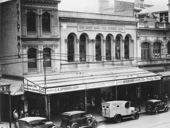 | Keywords: StateLibQld 1 77894 Daily Mail newspaper building in Queen Street, Brisbane, 1933.jpg en Daily Mail newspaper building in Queen Street Brisbane 1933 Elevated view showing the Daily Mail building and shops on the ground floor Some of the shops belong to C A Spurgin Son hairdressers Geo Dickson stationery and book store and Arthur Rofe mercer A truck and several motor vehicles are parked in the street Situated in Queen Street between Edward and Creek Streets 1933 handle 10462/deriv/139859 Item is held by John Oxley Library State Library of Queensland PD-Australia StateLibQld-License Newspaper buildings in Australia Vehicles in Australia Office buildings in Brisbane 1933 in Brisbane Black and white photographs |