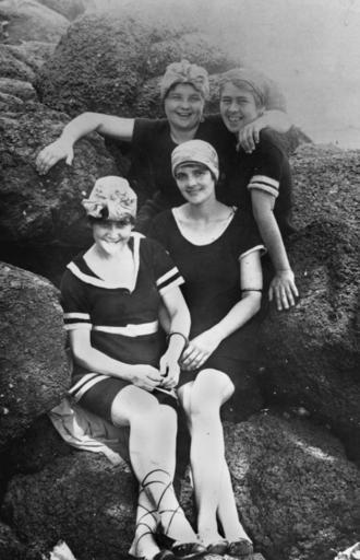 Keywords: StateLibQld 1 80287 Group of women posing in their swimming costumes on the rocks at Tweed Heads, 1920-1930.jpg en Group of women posing in their swimming costumes on the rocks at Tweed Heads 1920-1930 Four women in woollen swimsuits pose on rocks on the beach at Tweed Heads in the 1920s All four are wearing dark coloured swimsuits with light coloured contrasting trim and scarves tied around their heads One of the women front left is wearing shoes with laces criss-crossed up her ankles The woman seated next to her is wearing a 'slave bracelet' on her upper arm which was fashionable in the 1920s between 1920 1930 handle 10462/deriv/141941 Item is held by John Oxley Library State Library of Queensland Simpson C G PD-Australia StateLibQld-License Women's clothing of Australia Swimwear of Australia Rocks in Australia Beaches of New South Wales Shoes of Australia Australia in the 1920s 1920s swimwear Black and white photographs of Australia |