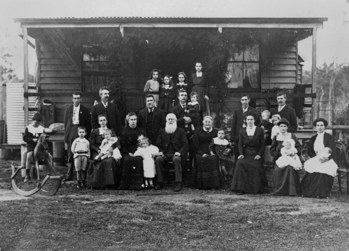 | Keywords: StateLibQld 1 84880 Extended family outside the Jenkinson home, Woodford, Queensland, ca. 1906.jpg en Extended family outside the Jenkinson home Woodford Queensland ca 1906 Multi-generational family photograph taken in front of a wooden house with front verandah Child on the left is wearing a sailor suit and riding a rocking horse Oldest members of the family seated centre front circa 1906 handle 10462/deriv/61983 Item is held by John Oxley Library State Library of Queensland PD-Australia StateLibQld-License Children of Queensland Babies of Australia Children's clothing of Australia Men's clothing of Australia Lace collars Woodford Queensland Black and white photographs Families of Queensland Rocking horses Verandas on cottages Queensland |