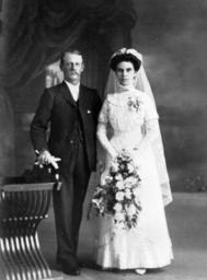Keywords: StateLibQld 1 96172 Frank Peters and his bride Ellen Eliza Shepherd, pictured on their wedding day, ca. 1905.jpg supplied with photograph circa 1905 handle 10462/deriv/74383 Item is held by John Oxley Library State Library of Queensland PD-Australia StateLibQld-License Portraits of Queensland Brides of Australia Grooms of Australia Wedding dresses in Australia Flower bouquets in Australia Black and white photographs |