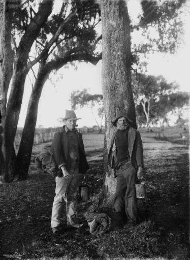 Keywords: StateLibQld 2 101864 Swagmen standing under trees, outback Queensland, ca. 1905.jpg en Swagmen standing under trees outback Queensland ca 1905 Two men smoking pipes wearing hats and carrying bed rolls and billycans which are used for boiling water to make tea circa 1905 handle 10462/deriv/69060 Item is held by John Oxley Library State Library of Queensland PD-Australia StateLibQld-License Black and white photographs Clothing of Australia |