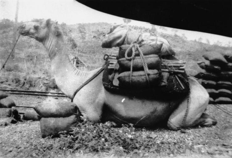 | Keywords: StateLibQld 2 126379 Camel taking first ore in sacks to Cloncurry, 1932.jpg en Camel taking first ore in sacks to Cloncurry 1932 First ore being taken to Duchess near Cloncurry The camel is resting under a shade 1932 handle 10462/deriv/80799 Item is held by John Oxley Library State Library of Queensland Plass L PD-Australia StateLibQld-License Black and white photographs Mount Isa Queensland Camels in Australia 1932 in Queensland Sacks Ores | ||||