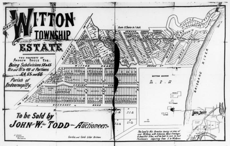 | Keywords: StateLibQld 2 130499 Witton Township real estate map, Indooroopilly, Brisbane, ca. 1880s.jpg en Witton Township real estate map Indooroopilly Brisbane ca 1880s The property of Andrew Bogle Esq To be sold by John w Todd Auctioneer The land in this direction having an area of over 70 acres with extensive river frontages and beautiful sites will be sold in lots to suit purchasers requiring from 5 to 30 acres information on map Map includes Ormond Terrace Witton Road Spring Street Boundary Road Bridge Street Maud Street Market Street Rennies Road and shows the location of Witton Manor between 1880 1890 handle 10462/deriv/79707 Item is held by John Oxley Library State Library of Queensland PD-Australia StateLibQld-License Black and white photographs Indooroopilly Queensland Brisbane in the 1880s Land auctions |