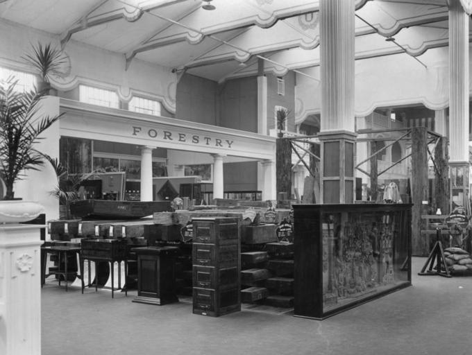 Keywords: StateLibQld 2 152695 Forestry display in the Australian Pavilion at the British Empire Exhibition, 1924.jpg en Forestry display in the Australian Pavilion at the British Empire Exhibition 1924 The Exhibition was opened by King George V on 23 April 1924 A large timber carving in a glass case is at the front of the display A selection of furniture including a file cabinet chairs tables boxes and drawers are also prominently displayed 1924 handle 10462/deriv/117902 Item is held by John Oxley Library State Library of Queensland Contributor s Queensland Newspapers Pty Ltd PD-Australia StateLibQld-License British Empire Exhibition 1924 Black and white photographs Architecture of Australia Furniture in Australia Timber in Australia Exhibits |