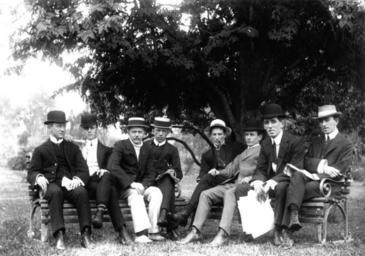 Keywords: StateLibQld 2 175795 Group of young men relaxing in a park, 1900-1910.jpg en Group of young men relaxing in a park 1900-1910 A group of dapper lads relax under the shade of a tree in a park The young men are sitting on two park benches reading newspapers and smoking pipes cigars and cigarettes All but one of the young men are wearing three piece suits and lace-up boots the exception being the young man third from the left whose outfit is in a more sporty style - light coloured long pants and shoes and a dark jacket over a turtleneck skivvy The men are wearing a variety of hats including boaters and bowler hats and their shirts display a number of different collar types between 1900 1910 handle 10462/deriv/100290 Item is held by John Oxley Library State Library of Queensland PD-Australia StateLibQld-License Men's clothing of Australia Black and white photographs Lounge suits in Australia Headgear of Australia 1900 in Australia Pipes smoking Sitting in the shade |