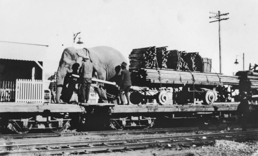 Keywords: StateLibQld 2 185639 Circus moving by train somwhere in Queensland, 1920s.jpg en Circus moving by train somwhere in Queensland 1920s Two workers can be seen unhitching a railway trolley from a harnessed elephant The unhitched trolley is being placed on top of another railway trolley The trolley is loaded with tent poles and stakes handle 10462/deriv/133874 Item is held by John Oxley Library State Library of Queensland PD-Australia StateLibQld-License Black and white photographs Railway lines in Australia Elephants of Australia Workers in Australia Circus in Australia |