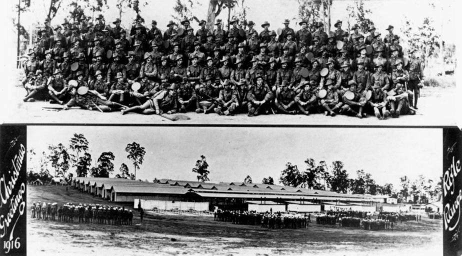 | Keywords: StateLibQld 2 189767 Christmas card showing Australian troops, military barracks and a rifle range, 1916.jpg supplied with photograph The top photograph is of a group of soldiers The lower photograph is a Christmas card showing rows of army buildings with a rifle range in front Groups of soldiers stand nearby 1916 handle 10462/deriv/135575 Item is held by John Oxley Library State Library of Queensland PD-Australia StateLibQld-License World War I home front in Australia Military uniforms of Australia Christmas cards of Australia Black and white photographs Barracks in Australia Soldiers of Australia 1916 in Australia |
