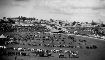 | Keywords: StateLibQld 2 212380 Cattle parading in the show ring in front of a large crowd at the Exhibition Ground, Brisbane, 1914.jpg en Cattle parading in the show ring in front of a large crowd at the Exhibition Ground Brisbane 1914 1914 handle 10462/deriv/133368 Item is held by John Oxley Library State Library of Queensland PD-Australia StateLibQld-License Agricultural exhibitions in Australia Agricultural fairs in Australia Black and white photographs Exhibition Grounds Brisbane Cattle in Australia Crowds in Australia Tents in Australia 1914 in Brisbane Exhibitions in Brisbane |