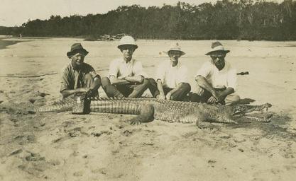 Keywords: StateLibQld 2 245411 Crocodile bagged on the Herbert River.jpg en Crocodile bagged on the Herbert River Unidentified sportmen with a ten foot crocodile Inscription on rear of postcard reads 'Sport on the Herbert ' handle 10462/deriv/119074 Item is held by John Oxley Library State Library of Queensland PD-Australia StateLibQld-License Images of postcards from the State Library of Queensland Black and white photographs Pith helmets in Australia Unidentified Crocodilia Headgear of Australia Hunting in Australia Herbert River |