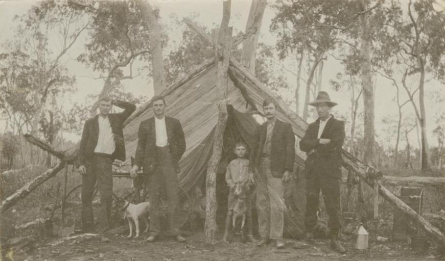 | Keywords: StateLibQld 2 253488 Hunting camp in North Queensland, ca. 1908.jpg en Hunting camp in North Queensland ca 1908 The tent is pitched over logs Four men two dogs and a young boy are posing outside the tent Two of the men have been named on the postcard They are Bob Stewart left and Jack Stewart right circa 1908 handle 10462/deriv/119881 Copied and digitised from a postcard PD-Australia StateLibQld-License Images of postcards from the State Library of Queensland Children's clothing of Australia Men's clothing of Australia Black and white photographs Tents in Australia Dogs of Australia Camping |