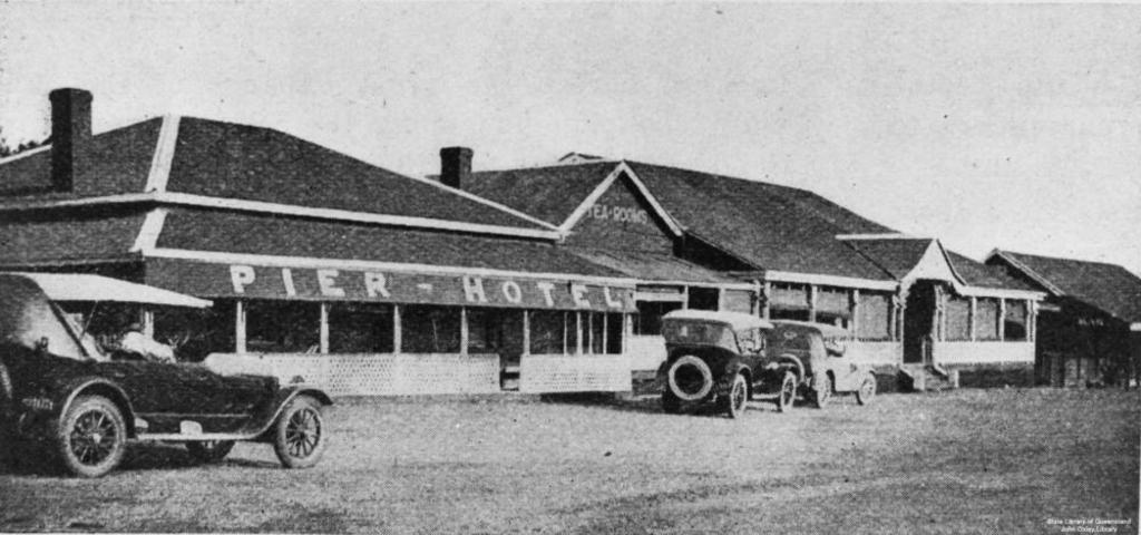 Keywords: StateLibQld 2 47528 Cleveland Pier Hotel, ca. 1923.jpg en Cleveland Pier Hotel ca 1923 Street view of the front of the Cleveland Pier Hotel showing the tea rooms with verandah and wooden blinds Three motor cars are parked on the unsealed road in front of the hotel This hotel was destroyed by fire in 1936 The caption on the postcard describes Cleveland as the garden of the south coast circa 1923 handle 10462/deriv/55952 Copied and digitised from an original postcard PD-Australia StateLibQld-License Images of postcards from the State Library of Queensland Black and white photographs Automobiles of Australia Hotels and pubs in Cleveland Queensland |