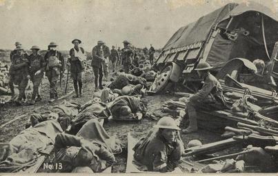 | Keywords: StateLibQld 2 66748 After the battle on the Menin Road, France, 1917.jpg en After the battle on the Menin Road France 1917 Wounded soldiers waiting to be taken to the dressing station Part of Our Boys at the Front series of postcards no 13 From official photographs by special permission of the Department of Defence Proceeds to the Australian Comforts Fund Printing on verso of postcard The Battle of the Menin Road was the first major Australian involvement in the series of British ˜bite and hold ™ attacks which began on 31 July 1917 Collectively these operations are known as ˜The Third Battle of Ypres ™ After moving through Ypres the First and Second Australian Divisions manned the front lines opposite Glencorse Wood Following a five-day bombardment the two Australian divisions advanced at 5 40 am on 20 September They were in the centre of an assault by 11 British divisions along Westhoek Ridge facing Glencorse Wood Although this battle was finally won by the allies the Australians sustained 5 000 killed and wounded 1917 handle 10462/deriv/2249 Copied and digitised from a postcard PD-Australia StateLibQld-License Images of postcards from the State Library of Queensland Military uniforms of Australia Military history of Australia Black and white photographs Australia in World War I Soldiers of Australia Trucks in Australia 1917 in Australia Wounded soldiers Battlefields People with helmets |