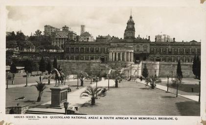| Keywords: StateLibQld 2 67518 Queensland National Anzac and South African War Memorials, Brisbane.jpg en Queensland National Anzac and South African War Memorials Brisbane Circular memorial is The Shrine of Remembrance in Anzac Square which has an eternal flame The building in the background is Central Railway Station featuring an ornate clock tower Part of the Sidues series of postcards no 819 handle 10462/deriv/2332 Copied and digitised from a postcard PD-Australia StateLibQld-License Images of postcards from the State Library of Queensland Monuments and memorials in Queensland Train stations in Queensland War memorials in Queensland Black and white photographs Clock towers in Queensland ANZAC Square Brisbane Sidues postcard series |