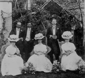 Keywords: StateLibQld 2 69743 Attendants from the Persse - Parry-Okeden wedding in the gardens of Delamore, Kedron, Brisbane, 1907.jpg en Attendants from the Persse - Parry-Okeden wedding in the gardens of Delamore Kedron Brisbane 1907 The bridesmaids and groomsmen from the Persse - Parry-Okeden wedding in the gardens of Delamore at Kedron in October 1907 Bridesmaids were Miss Constance Parry-Okeden Miss Jessie Persse and Miss Leila Slade Groomsmen were Mr De Burgh D D Persse Best Man Captain F Newton and Mr L H C Morgan The wedding was between Miss Violet-Vivian Parry-Okeden and Mr Charles D Persse The ceremony took place at St Andrew's Church Lutwyche and the reception in the gardens of the grand residence Delamore The bridesmaids wore dresses trimmed with violet designs and carried baskets 'ornamented with heliotrope ribbons and bunches of violets' in honour of the bride's name Information taken from The Queenslander 12 October 1907 1907-10-01 handle 10462/deriv/84621 The Queenslander 12 October 1907 p 24 PD-Australia StateLibQld-License Wedding ceremonies in Australia Women's clothing of Australia Men's clothing of Australia Black and white photographs Bridesmaids of Australia Kedron Queensland 1907 in Australia |