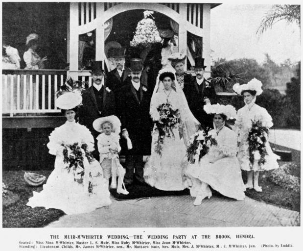 Keywords: StateLibQld 2 86848 Muir-McWhirter wedding party at the Brook, Hendra, Brisbane, Queensland.jpg en Muir-McWhirter wedding party at the Brook Hendra Brisbane Queensland Large wedding group posing on the front steps The men are wearing top hats morning suits gloves and buttonholes The demure bride is wearing a highly decorated dress and long veil Her attendants are also in elaborate dresses and enormous hats 1905 handle 10462/deriv/63023 The Queenslander 16 September 1905 p 21 Contributor s The Queenslander PD-Australia StateLibQld-License Black and white photographs Bridesmaids of Australia Portraits of Queensland Headgear of Australia Brides of Australia Grooms of Australia 1905 in Australia |