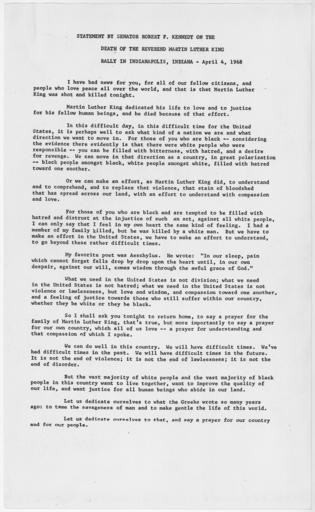 Keywords: Statement by Senator Robert F. Kennedy on the Death of the Reverend Martin Luther King April 4, 1968 - NARA - 194037.jpg Scope and content Remarks by Senator Robert F Kennedy at a campaign rally in Indianaplis Indiana following the assassination of Martin Luther King Jr General notes 194037 Local identifier Kennedy Robert F Robert Francis 1925-1968 John F Kennedy Library NLJFK Columbia Point Boston MA 02125-3398 1968-04-04 Record group Collection JFK-RFK Robert F Kennedy Papers 1937 - 06/06/1968 Record group ARC 1169 Robert F Kennedy Papers Senate Papers Speeches and Press Releases compiled 1965 - 1968 Series ARC 194019 File unit Robert F Kennedy Papers Senate Papers Speeches and Press Releases 04/01/1968 - 04/04/1968 File unit ARC 194036 Variant control numbers NAIL Control Number NLK-RFK-SNFILESSPPR-040168TO040468-7FFFR Other versions <gallery> File Statement_by_Senator_Robert_F _Kennedy_on_the_Death_of_the_Reverend_Martin_Luther_King_April_4 _1968_-_NARA_-_194037 tif tif File Statement_by_Senator_Robert_F _Kennedy_on_the_Death_of_the_Reverend_Martin_Luther_King_April_4 _1968_-_NARA_-_194037 jpg jpg </gallery> NARA-cooperation PD-USGov Speeches by Robert F Kennedy Martin Luther King Jr 1968 texts 1968 in Indianapolis |