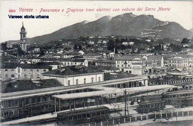 Keywords: Immagine presa da Giubiano, in basso a sinistra la stazione delle Ferrovie dello Stato (1865), alle sue spalle lo stabilimento della Carrozzeria Macchi e la cupola del Politeama. Più a destra l'imbocco di via Morosini con l'albergo Isola Magenta. varese |