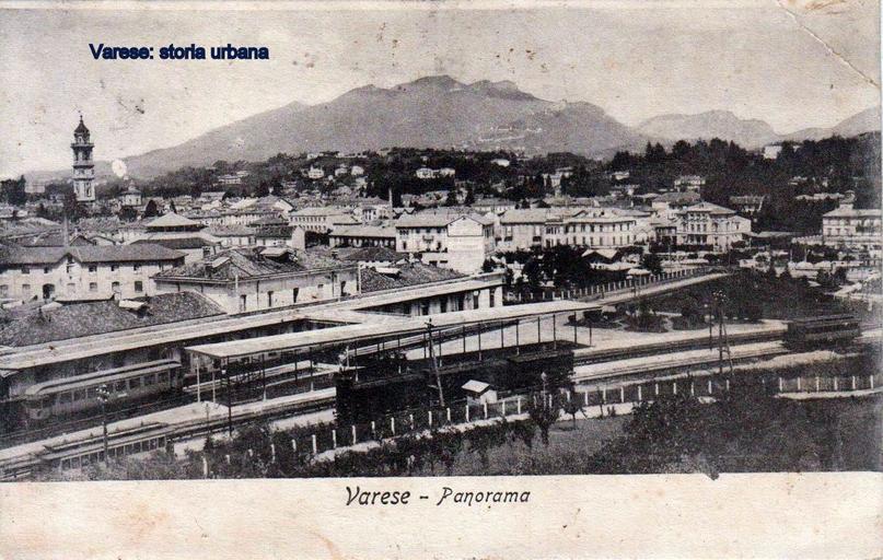 Keywords: Immagine presa da Giubiano, in basso a sinistra la stazione delle Ferrovie dello Stato (1865), alle sue spalle lo stabilimento della Carrozzeria Macchi e la cupola del Politeama. A destra l'imbocco di via Morosini con l'albergo Isola Magenta, all'estrema destra l'edificio del Calzaturificio di Varese.