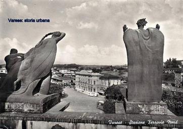 Keywords: La stazione delle Ferrovie Nord Milano (1885) ripresa da una terrazza del palazzo delle poste. Dietro la stazione lo spazio occopato l'attuale piazzale Kennedy risulta ancora vuoto. varese