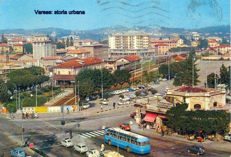 Keywords: In centro la stazione delle Ferrovie Nord Milano (1885), dietro è visibile la torre dei Molini Marzoli Massari. A destra l'edificio poligonale del caffè ristorante Martinelli. varese