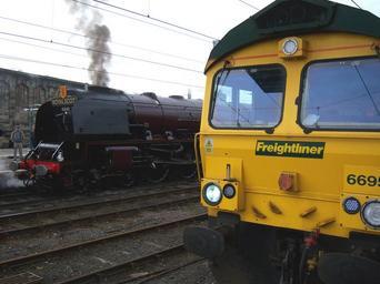 | Keywords: Steam locomotive 6233 Duchess of Sutherland Carlisle Royal Scot 10 Oct 2009 pic 4.jpg Preserved British steam locomotive w LMS Princess Coronation Class 6233 Duchess of Sutherland No 6233 Duchess of Sutherland stands at Platform 3 of Carlisle railway station waiting to depart on the southbound return leg of the Royal Scot railtour while on Platform 4 a Freightliner Group Limited Freightliner British Rail Class 66 Class 66/9 diesel locomotive No 66951 passes through southbound also See also File Steam locomotive 6233 Duchess of Sutherland Carlisle Royal Scot 10 Oct 2009 pic 3 jpg own 2009-10-10 Ultra7 Trains at Carlisle railway station LMS Princess Coronation Class 6233 Duchess of Sutherland Charter trains of the United Kingdom British Rail Class 66s of Freightliner 66951 British Rail Class 66s in Freightliner green livery 66951 British Rail Class 66s on the West Coast Main Line 66951 Trains of Freightliner on the West Coast Main Line 66951 |