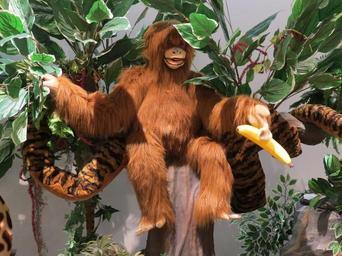 Keywords: steiff animals steiff tierchen stuffed animal soft toy teddy bear snuggle play toys soft cuddly purry exhibition museum children children toys monkey äffchen orangutan jungle palm artificial sit banana