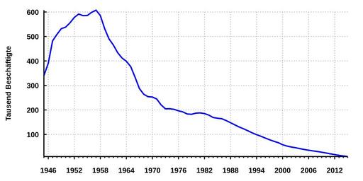 | Keywords: Steinkohle arbeiter.svg de Arbeiter im Steinkohleabbau in Deutschland 2016-02-01 own StefanPohl other versions v reset set term svg size 800 400 fname 'Arial bold' fsize 16 lw 2 set grid lc rgb ' AAAAAA' lt 2 dt ' ' lw 75 set border 3 set tics nomirror scale 5 set xtics out set autoscale fix set style line 1 lc rgb 'blue' lw 1 5 unset key basename 'steinkohle_' outext ' svg' inext ' txt' set timefmt ' Y' set xdata time set format x ' Y' current basename 'arbeiter' set ylabel 'Tausend Beschäftigte' set output current outext plot current inext u 1 2/1e3 w l ls 1 unset output current basename 'foerderung' set ylabel 'Millionen Tonnen' set output current outext plot current inext u 1 2/1e6 w l ls 1 unset output current basename 'bergwerke' set ylabel 'Bergwerke' set output current outext plot current inext u 1 2 w l ls 1 unset output cc-zero Coal mining in Germany |