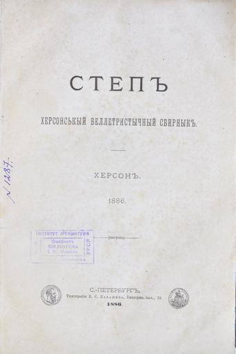 Keywords: Step zbirnyk 1441.jpg Степъ Хе сонський беллет истичний сбі никъ Хе сонъ 1886 Санкт-Пете бу г 1886 Титульний а куш З особистої бібліотеки І Ф анка 1886 Institution Shevchenko Institute of Literature Digital Collection PD-old-70-1923 1790 books from Germany Franko Personal Library Collections of books in libraries in Ukraine Shevchenko Institute of Literature Uploaded with VicuñaUploader