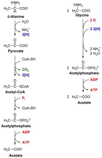Keywords: Stickland fermentation English.svg en fermentation according to Stickland exempflified with D-alanine and glycine de Stickland-Gärung am Beispiel von D-Alanin und Glycin Own <br> Stickland fermentation svg 19 24 20 January 2012 UTC Ed Edgar181 Carbohydrate metabolism |