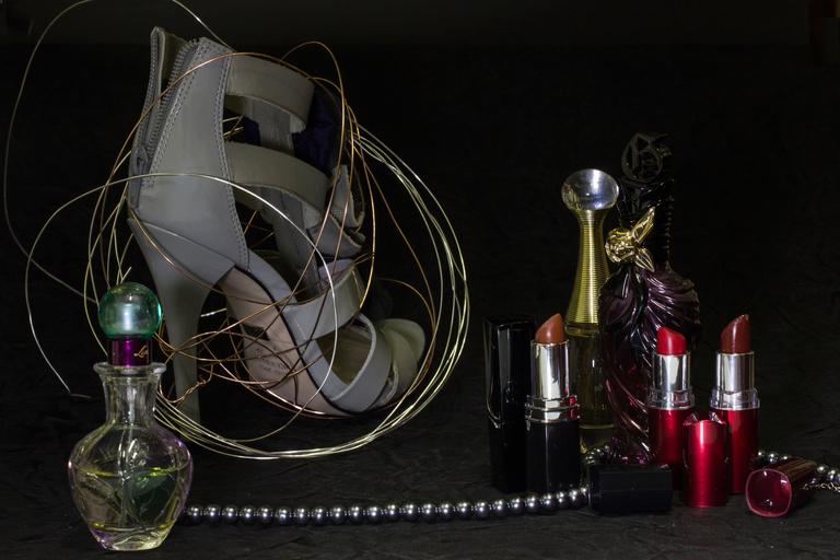 Keywords: still life lipsticks perfumes beads shoe high heeled shoe