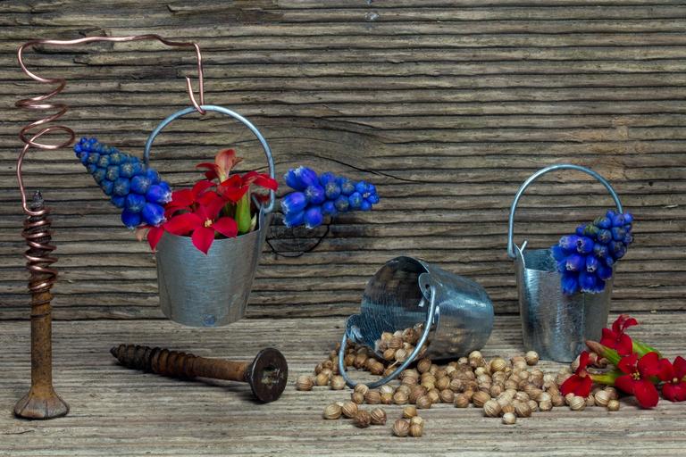 Keywords: still life screw seeds decor metal rusted wood wooden structure flowers hyacinth