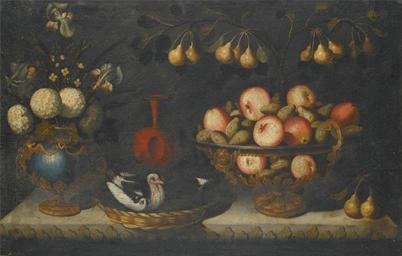 | Keywords: Still Life with Flowers in Vase, Apples & Pears by Bernardo Polo.jpg en Still Life with Flowers in a Gilt-Mounted Bluestone Vase and a Bowl of Apples with a Sprig of Pears by Bernardo Polo c 1650-75 oil on canvas 73 by 112 cm Sotheby's Bernardo Polo c 1650-75 Bernardo Polo PD-old-100 |