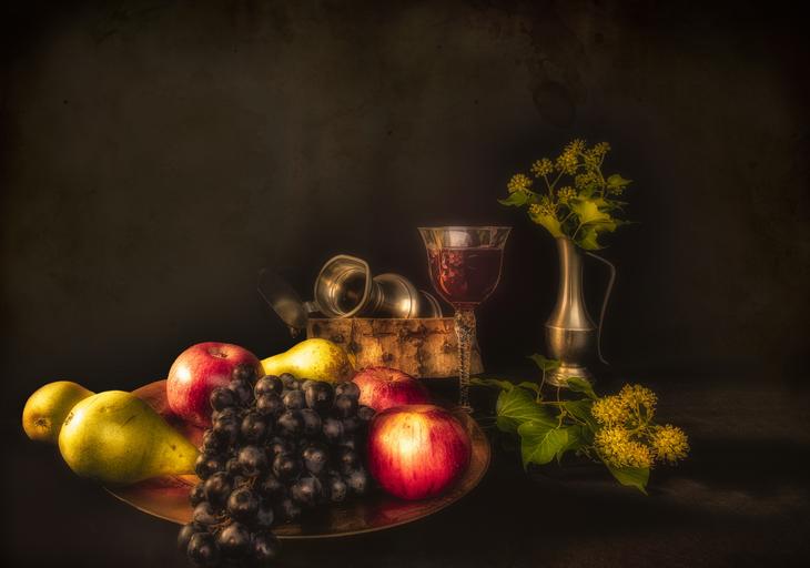 Keywords: still lifes fruit pears apples grapes glass of wine pitcher ivy vase