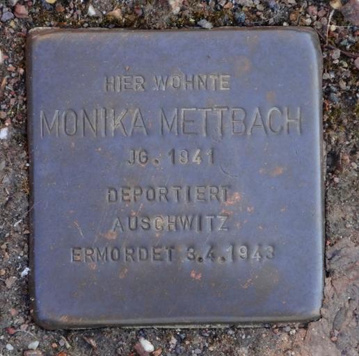 Keywords: Stolperstein Ulmenweg 16, Siebleben.JPG de Stolperstein Ulmenweg 16 Siebleben Gotha 2015-02-22 11 31 39 own Aschroet other versions other fields 1 inscription inscription HIER WOHNTE<br /><big>MONIKA METTBACH</big><br />JG 1941<br />DEPORTIERT<br />AUSCHWITZ<br />ERMORDET 3 4 1943 de 50 946146388889 10 742258055556 heading 52 5 cc-zero Uploaded with UploadWizard Stolpersteine in Gotha Siebleben |