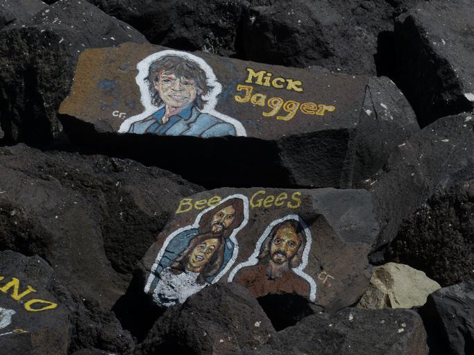 Keywords: stones painted art painter idea shore stones stars musician santa cruz tenerife man person famous bee gees mick jagger