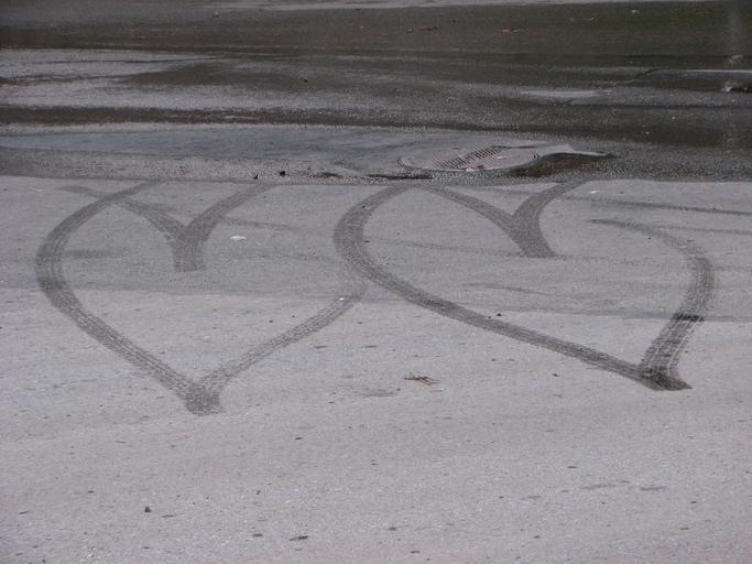 Keywords: Stopy pneumatik.JPG en Car traces on the pavement by Brněnská přehrada own own photo HTO 2009-06-10 Gray on gray photos Tires Heart shapes