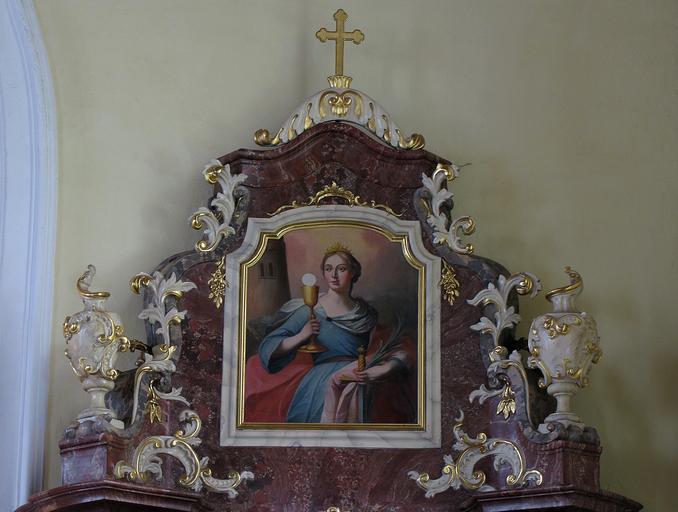 Keywords: Stotzheim StNicolas56.JPG Alsace Bas-Rhin Stotzheim Église Saint-Nicolas Autel secondaire Ste-Catherine XVIIIe-XIXe Tableau Ste-Barbe own 2013 Ralph Hammann cc-by-sa-3 0 Artwork / Œuvre d'art / Kunstwerk Artist calice palme épée XIXe siècle oil canvas cm Eglise Saint-Nicolas Stotzheim Autel secondaire PM67000327 IM67006039 object history other versions Ralph Hammann PD-old accession number Photographs of Stotzheim by Ralph Hammann Taken with Canon PowerShot SX20 IS Autels secondaires Église Saint-Nicolas de Stotzheim Wooden reliefs in Bas-Rhin Baroque reliefs in Alsace 18th-century wooden reliefs in Alsace Objets monuments historiques in Bas-Rhin church paintings Neoclassical church paintings in Alsace 19th-century church paintings in Alsace Paintings of Saint Barbara |