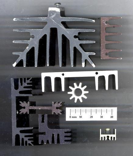 Keywords: Strangkkp.jpg en extruded heat sink profiles Kühlkörper für Leistungselektronik aus Aluminium-Strangpress-Profilen teilweise schwarz bzw braun eloxoiert own 2007-09-26 Ulfbastel PD Heat sinks Extrusion