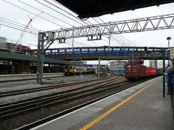 Keywords: Stratford-Stn-(Ldn)-NewNLL-Platforms.jpg en Stratford station in east London showing the new North London Line platforms on the left a train on a working to Stansted airport at platform 12 a freight train passing through platform 10a plus a trainspotter on platform 10 recording the numbers of the various trains seen passing through the station Above the station can be seen the partially complete new walkway which will allow pedestrians who do not wish to enter the station to walk between the historic Stratford town centre and the new Westfield shopping centre Own Spsmiler 2009-05-08 11 19 45 Stratford station |