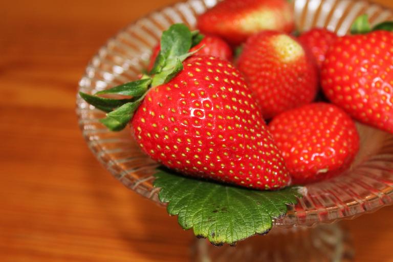 Keywords: strawberries fruit bowl shell glass bowl leaf green red table deco fruit vitamins frisch sweet delicious healthy ripe fruits food strawberry fruit fruity nature dessert summer eat appetizing tasty meal garden harvest buffet benefit from