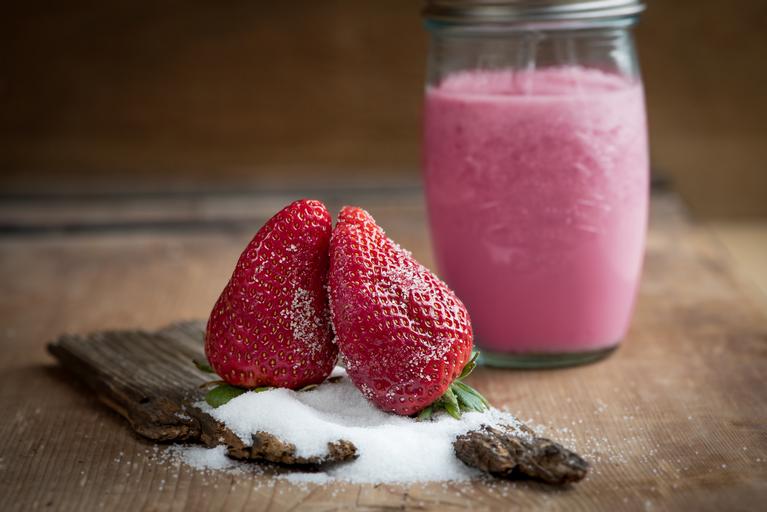 Keywords: strawberries ripe red healthy delicious sweet soft fruit fruit sugar granulated sugar strawberry milk food vitamins fruity tasty glass nutrition vegan eat drink blended close food-photography