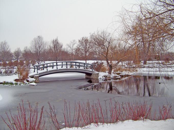 Keywords: stream bridge snow lake winter frozen snowfall footbridge
