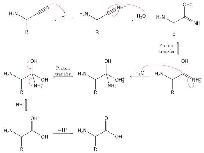 Keywords: Strecker's amino acid synthesis mechanism part 2.svg en Strecker's amino acid synthesis mechanism part 2 own Krishnavedala 2014-08-05 validSVG LaTeX source code 250px <syntaxhighlight lang latex > \documentclass12pt border 5pt standalone \usepackageT1 fontenc \usepackageutf8 inputenc \usepackage chemfig chemmacros \usepackage lmodern \chemsetupchemformula font-shape sf format \sffamily \renewcommand \printatom1 \ensuremath \mathsf 1 \setatomsep 2 5em \setdoublesep 6ex \setarrowdefault 1 2 \setbondstyle thick \begin document \schemestart \chemfig H_2N- -30 -6R - 30~ 0 a1 N \arrow < >\chemfig a2 H \scriptstyle+ \chemfig H_2N- -30 -6R - 30 b1 ~ b2 0 b3 NH \scriptstyle+ \arrow < >\chemfig H_2 b4 O \chemfig H_2N- -30 -6R - 30 -2OH_2 \scriptstyle+ -30NH \arrow < > 0 \parbox 1 5cm \small Proton transfer -90 9 \chemfig H_2N- -30 -6R - 30 c1 -2OH c2 -30 c3 NH_2 \scriptstyle+ \arrow ->\chemfig H_2 c0 O 180 \chemfig H_2N- -30 -6R - 30 -2OH - -30OH_2 \scriptstyle+ - -75NH_2 \arrow < > 0 south \parbox 1 5cm \small\centering Proton transfer 180 \chemfig H_2N- -30 -6R - 30 - d1 2 d2 OH - -30OH - d3 -75 d4 NH_3 \scriptstyle+ \arrow < > 0 - \chemfig NH_3 -90 9 \chemfig H_2N- -30 -6R - 30 2OH \scriptstyle+ - -30OH \arrow -> - \chemfig H \scriptstyle+ \chemfig H_2N- -30 -6R - 30 2O - -30OH \chemmove-> red shorten < 3pt shorten > 3pt -stealth \draw a1 controls + north east 8mm and + north 5mm a2 ; \draw b2 controls + south 8mm and + south 5mm b3 ; \draw b4 controls + north 10mm and + north 12mm b1 ; \draw c2 controls + south 10mm and + south 10mm c3 ; \draw c0 controls + north 10mm and + north west 10mm c1 ; \draw d2 controls + west 5mm and + west 5mm d1 ; \draw d3 controls + west 5mm and + west 5mm d4 ; \schemestop \end document </syntaxhighlight> cob Strecker reaction Cc-zero |