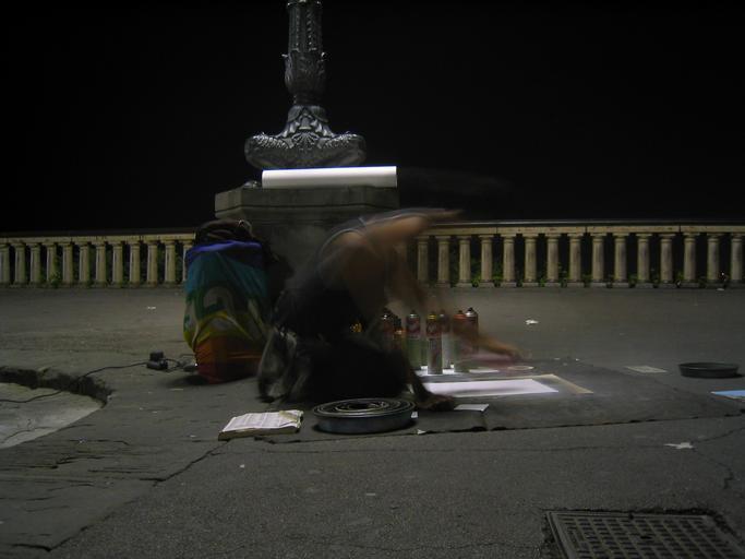 Keywords: Street artist in Florence, Italy.jpg Street Artist in Florence Italy 2003-09-26 own assumed Timmygb Night in Florence Long exposure photography Persons with motion blur Street art in Italy Street artists Artists at work